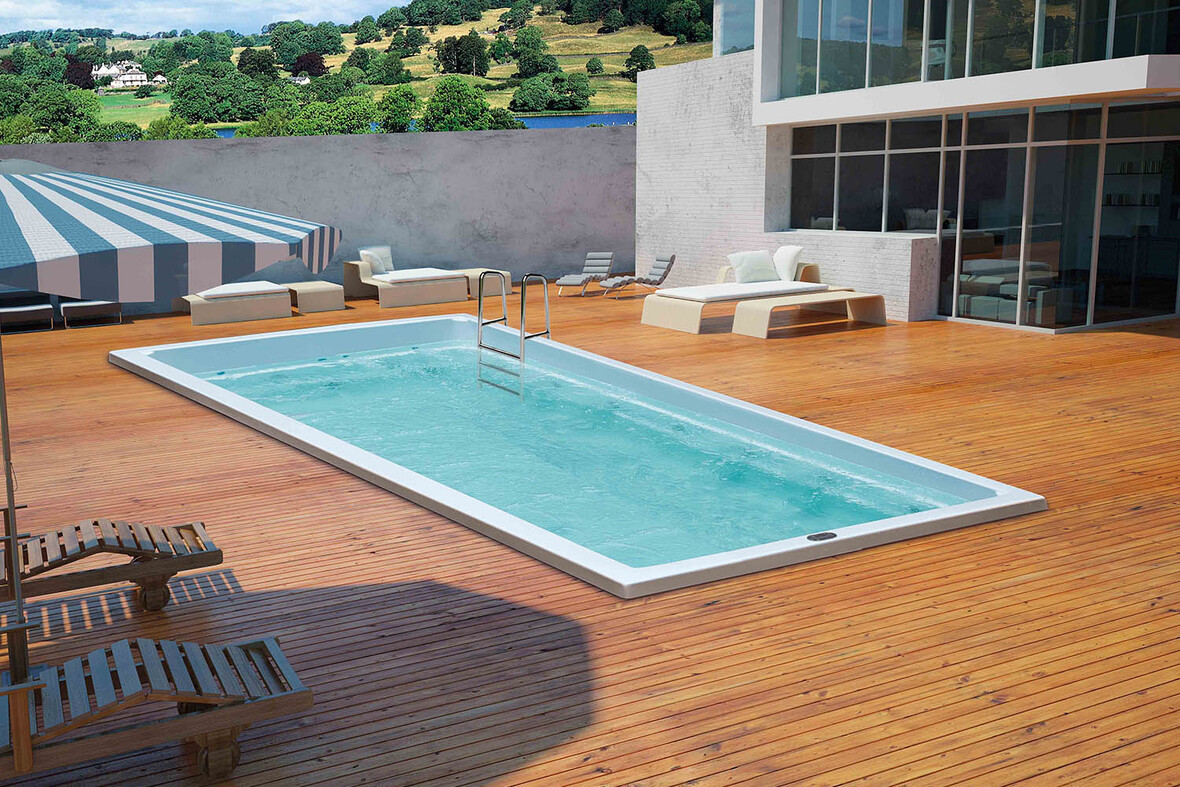 The pool features a simple design with various shapes, including round, square, and irregular large spa pools for multiple users. Easy-to-use system with most pools reaching 1.5m in depth and up to 3m in width. The PC Series includes smart control, filtration, sterilization, and heating systems, with optional upgrades available. The intelligent endless swimming system offers a unique pool experience